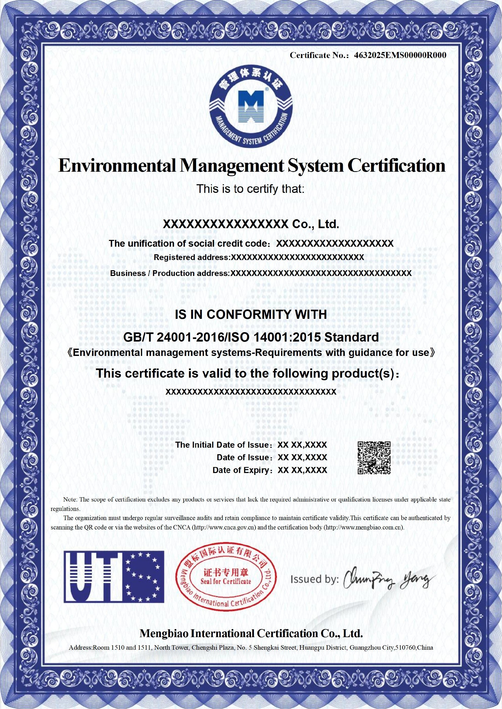 環(huán)境管理體系認(rèn)證證書(shū)——英文版證書(shū)