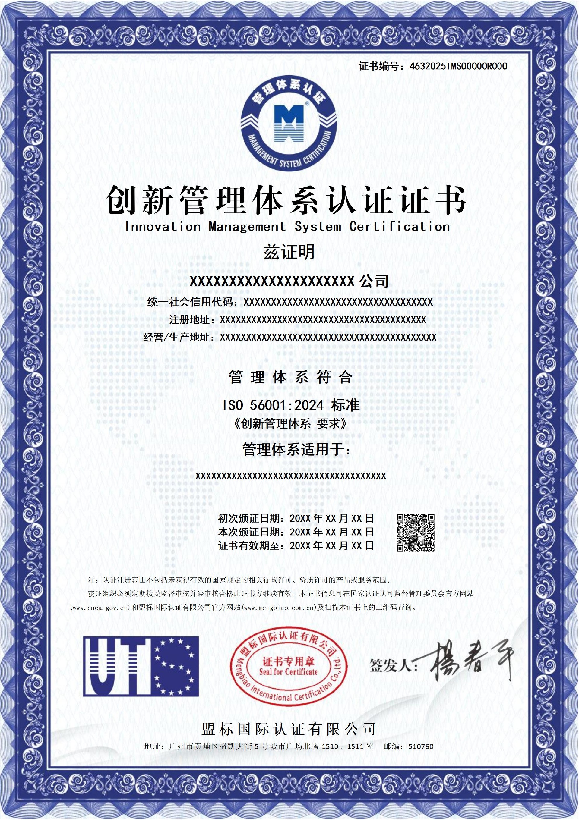 創(chuàng)新管理體系認(rèn)證證書-樣版