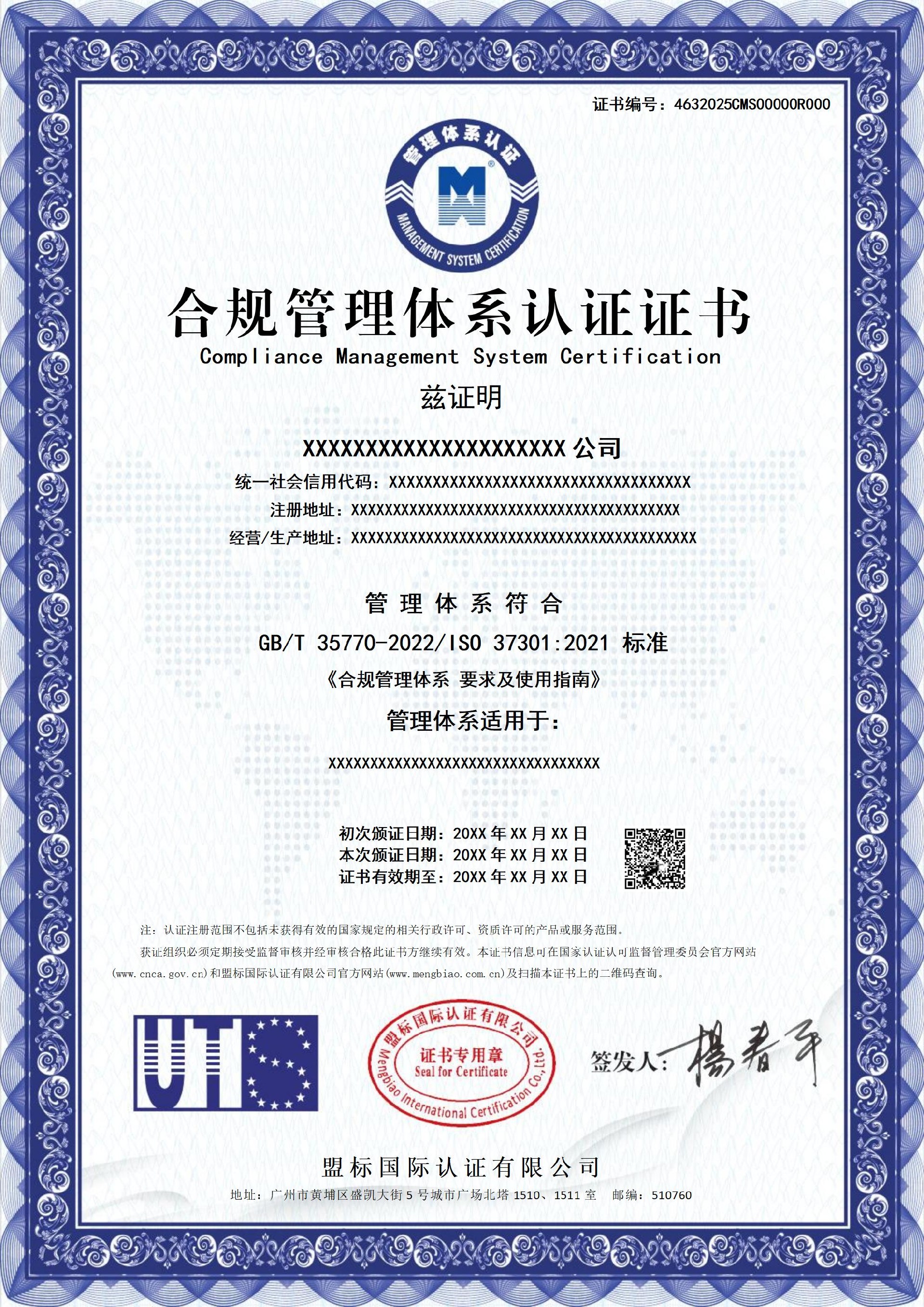 合規(guī)管理體系認(rèn)證證書-樣版