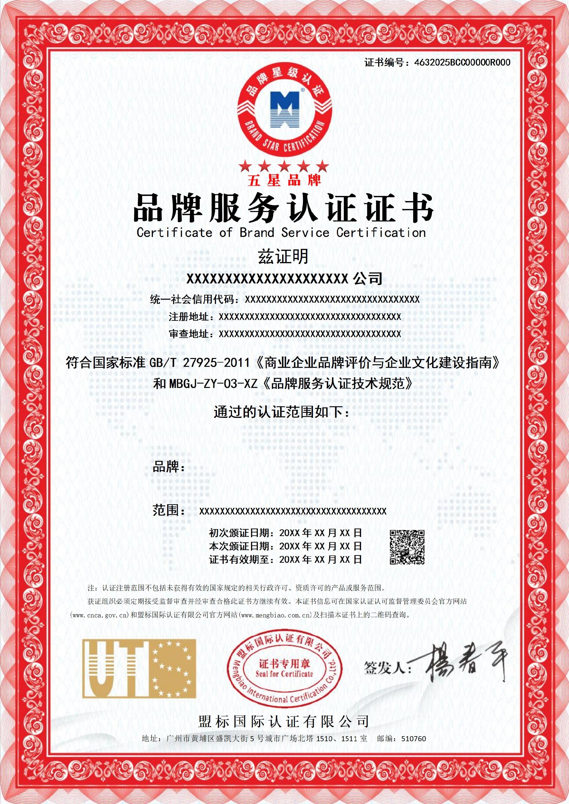 品牌服務(wù)認(rèn)證證書-樣版