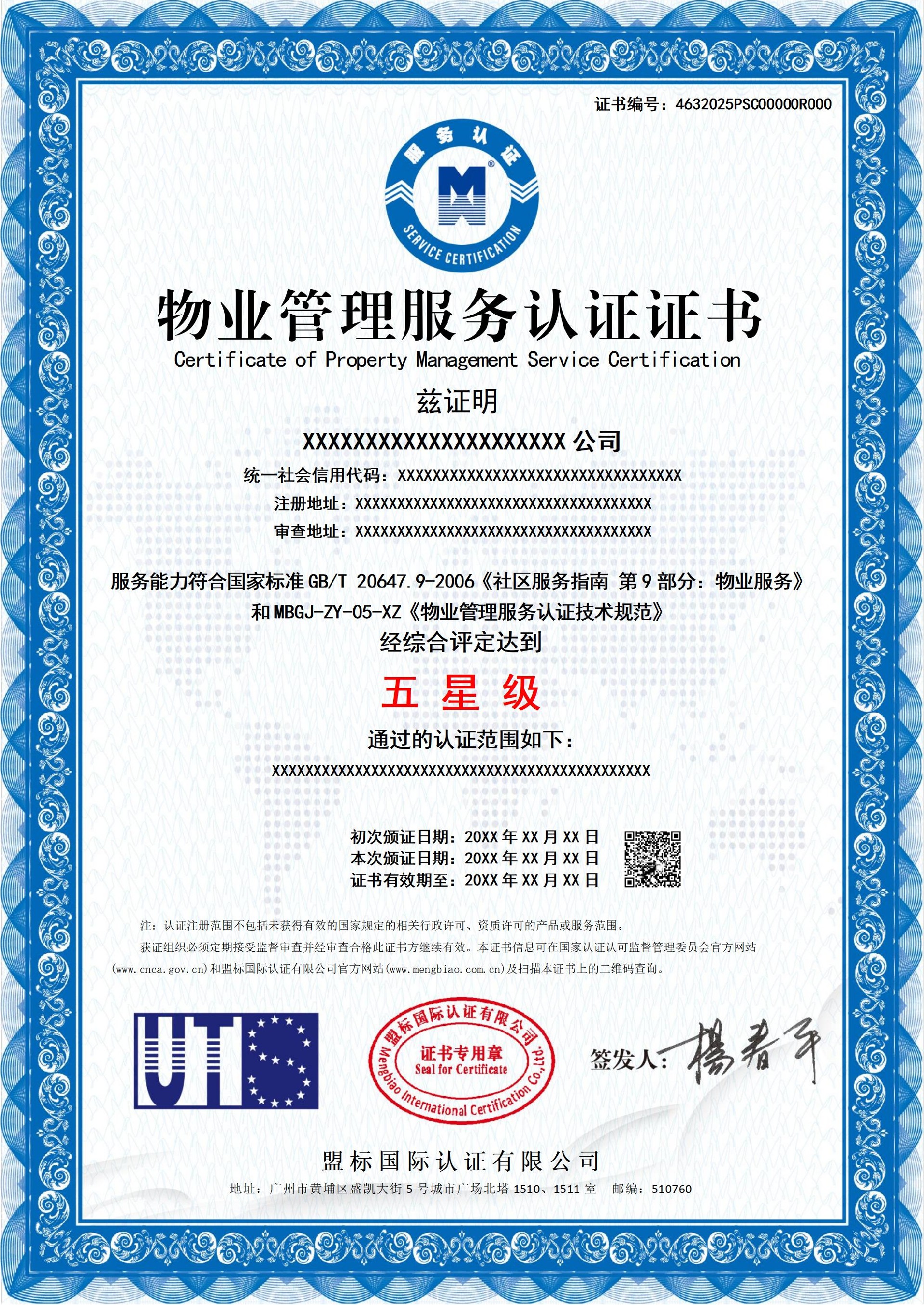 物業(yè)管理服務認證證書-樣版